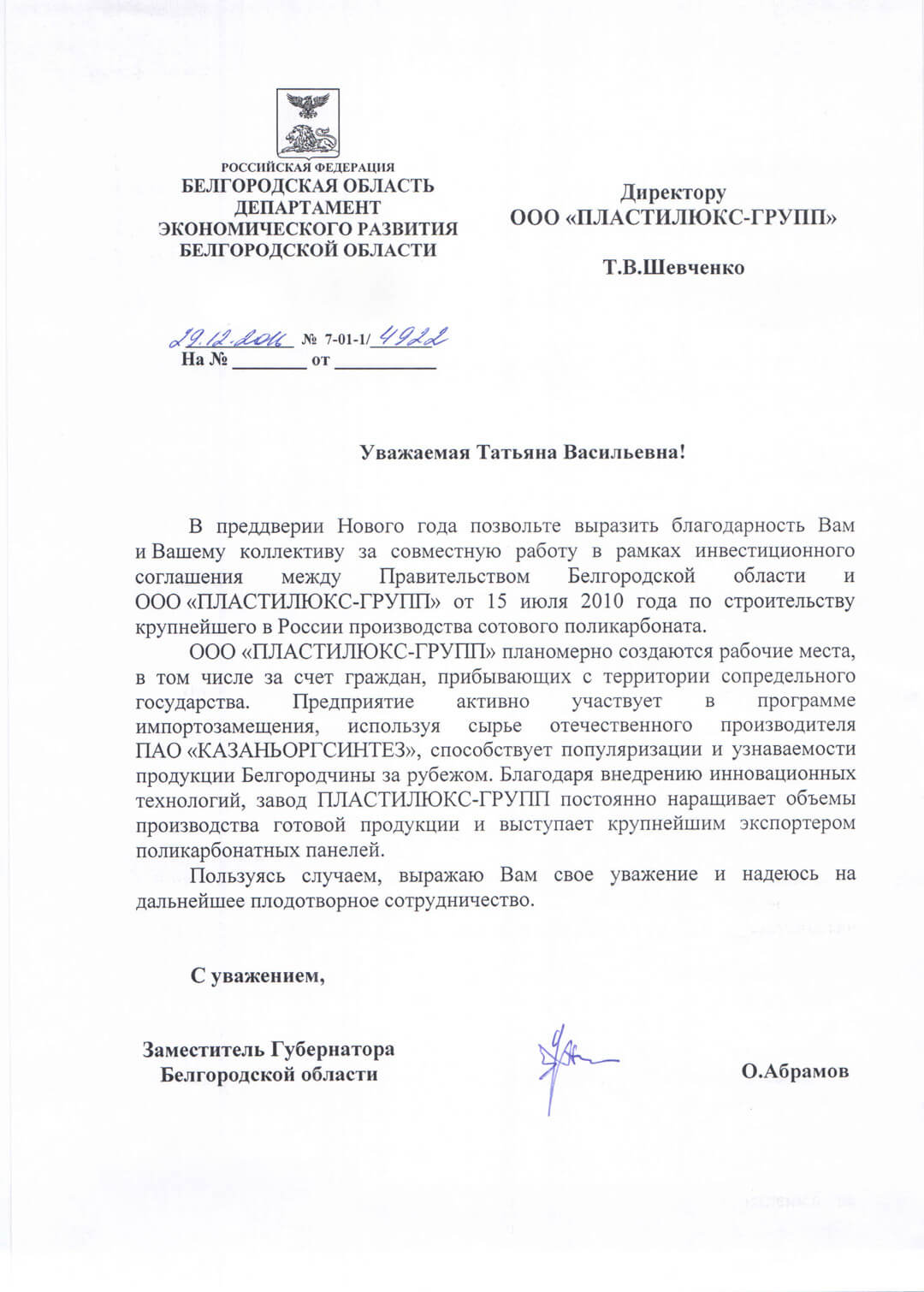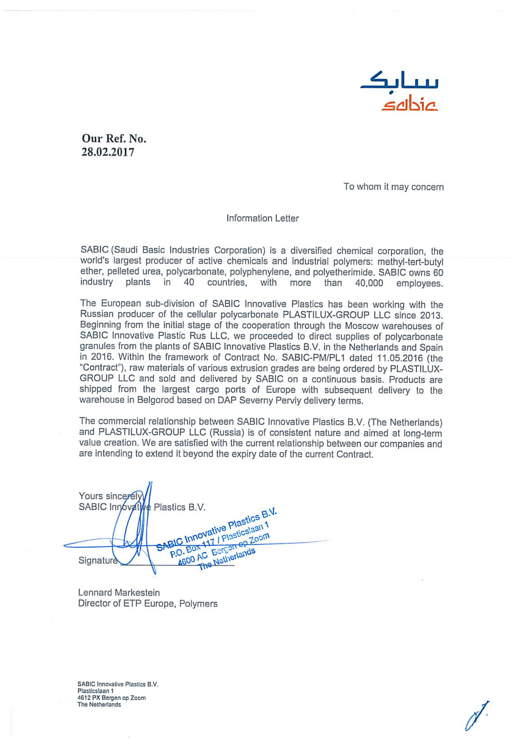 Коммерческие взаимоотношения SABIC Innovative Plastics B.V. (Нидерланды) и ООО «ПЛАСТИЛЮКС-ГРУПП» (Россия) носят системный характер и рассчитаны на длительный период времени. Мы довольны текущим уровнем взаимодействия между нашими компаниями и планируем дальнейшее расширение сотрудничества, в рамках действующего контракта. Белгородский завод сотового поликарбоната располагает высоким производственным потенциалом и является надёжным стратегическим Партнёром.
