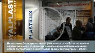 Сотовый поликарбонат премиум-класса ROYALPLAST впервые был представлен в Москве в 2012 году на крупнейшей международной строительной выставке «MosBuild». Видео-презентация технологического процесса производства сотового поликарбоната вызвала большой интерес со стороны владельцев престижного загородного жилья класса люкс, а также фирм-застройщиков жилых комплексов премиального уровня. На стенде предприятия была продемонстрирована новая технология PLASTILUX GROUP – нанесение высококонцентрированной уф-защиты с двух сторон листа толщиной 50 микрон, которая позволяет создать абсолютный барьер на пути разрушающего воздействия ультрафиолетовых лучей. Благодаря этому новшеству, для самых взыскательных клиентов появилась возможность приобретения превосходного поликарбоната европейского уровня по цене российского производителя.